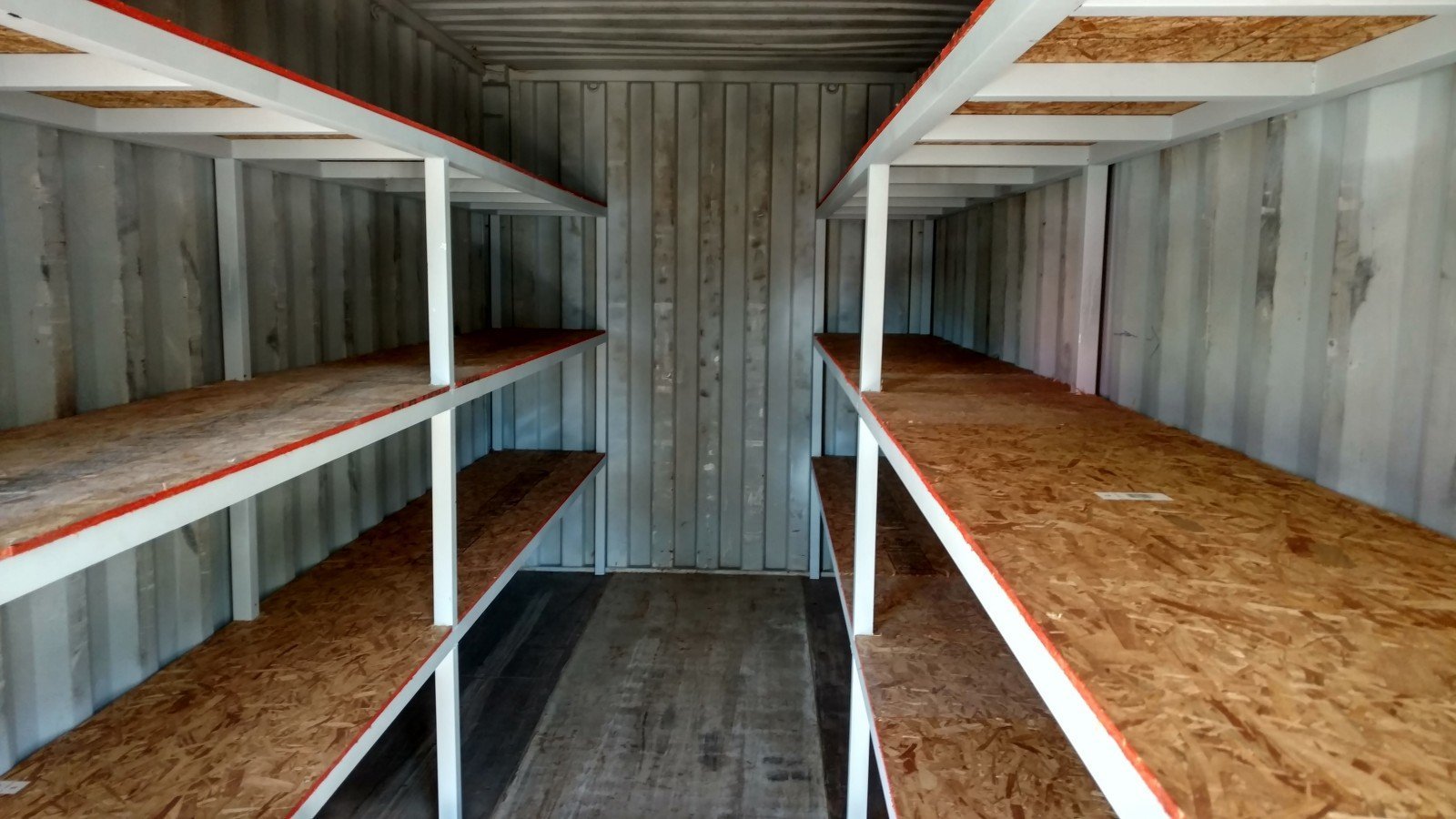 Install heavy-duty steel shelving inside your storage container to organize and review cargo with ease. Custom installation required.